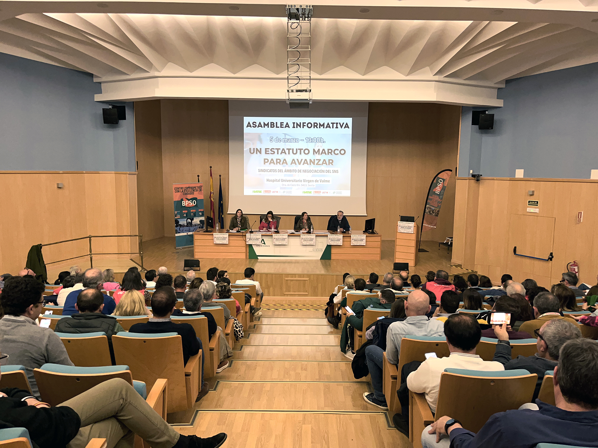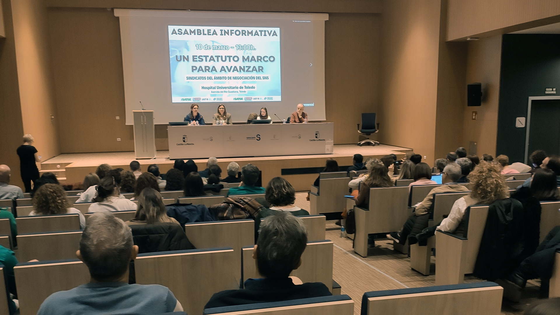 Los sindicatos con representación en el Ámbito de Negociación, SATSE-FSES, FSS-CCOO, UGT y CSIF, continúan con la celebración de asambleas informativas para dar a conocer el contenido del Anteproyecto de Ley del Estatuto Marco del personal estatutario de los servicios de salud y hoy han informado a profesionales del Hospital General Universitario de Toledo.